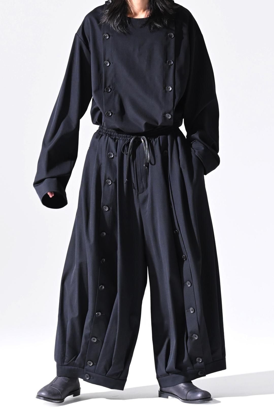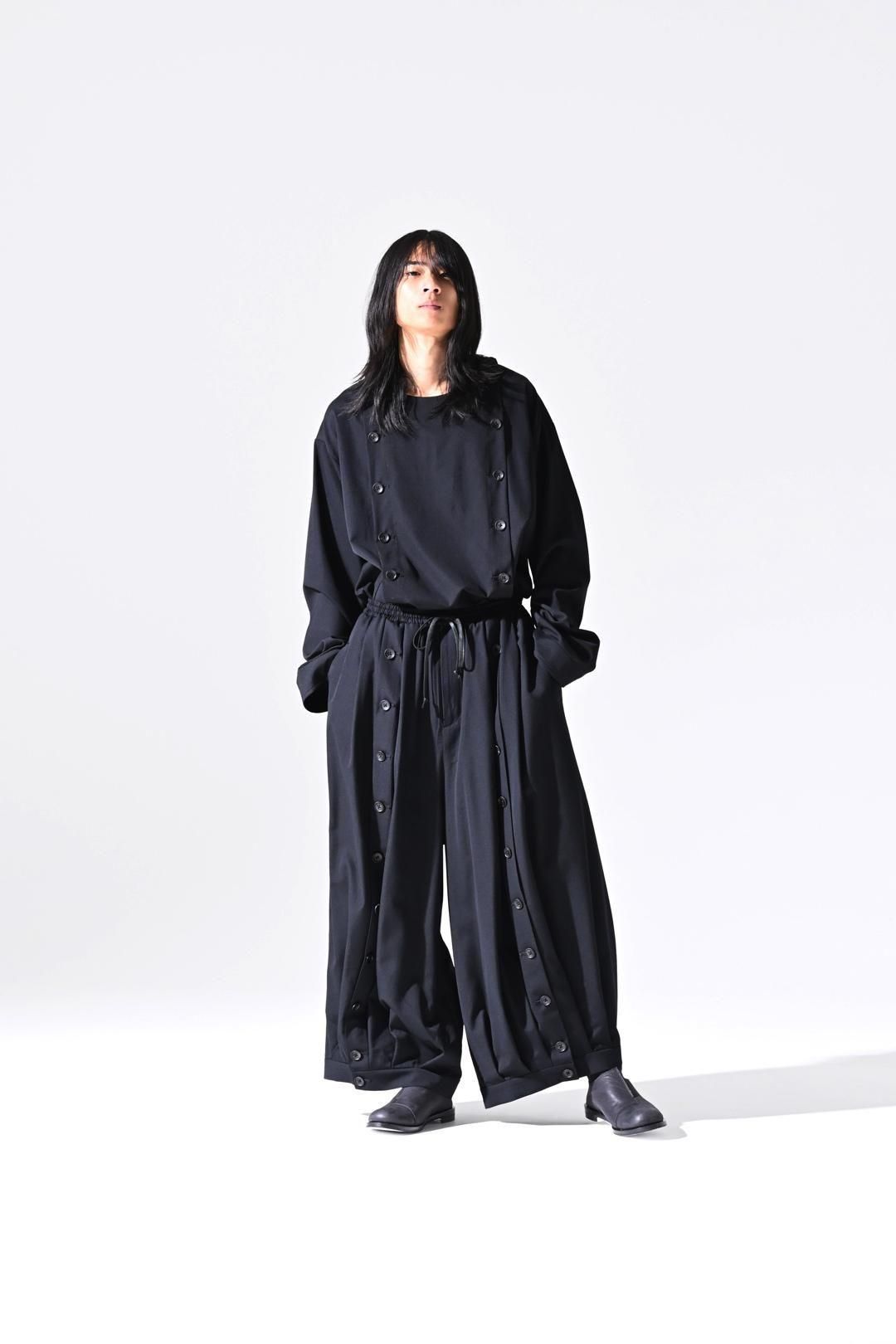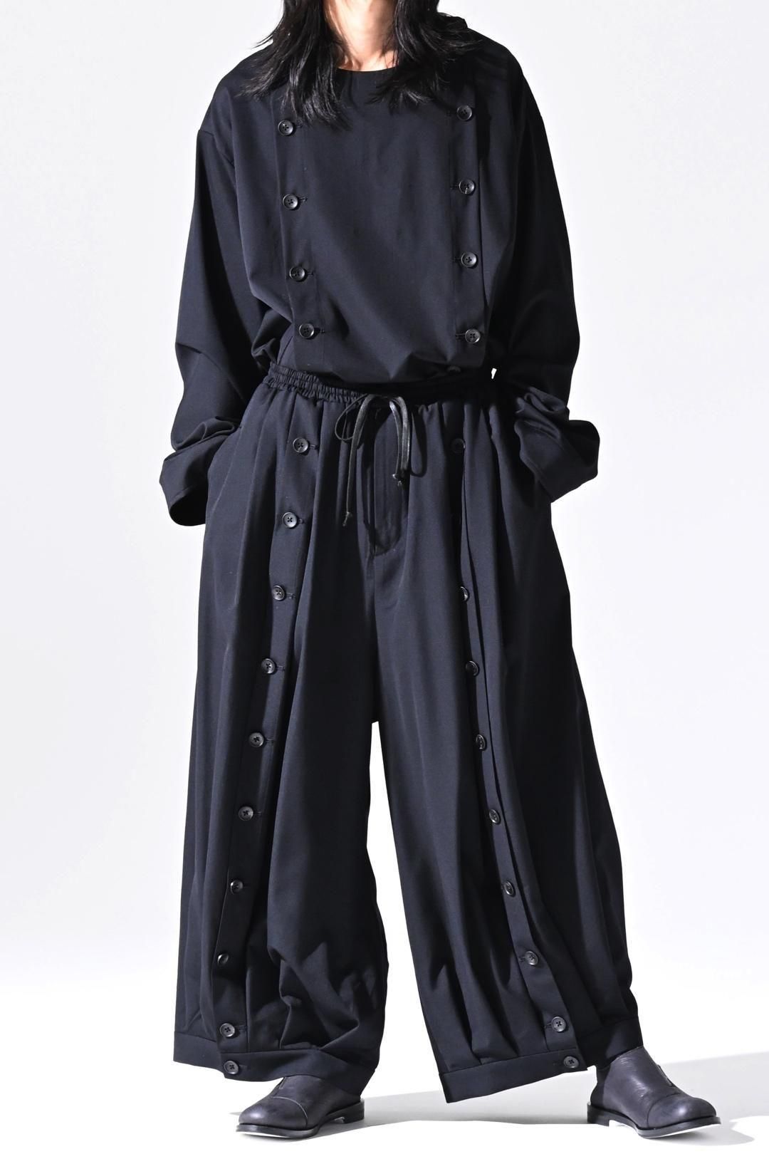 高級毛織物の産地"尾州"でBISHOOLオリジナルで生産したウールギャバジンを分量多く使用し、職人が手掛ける本水牛ボタンを贅沢に配したビッグパンツ。