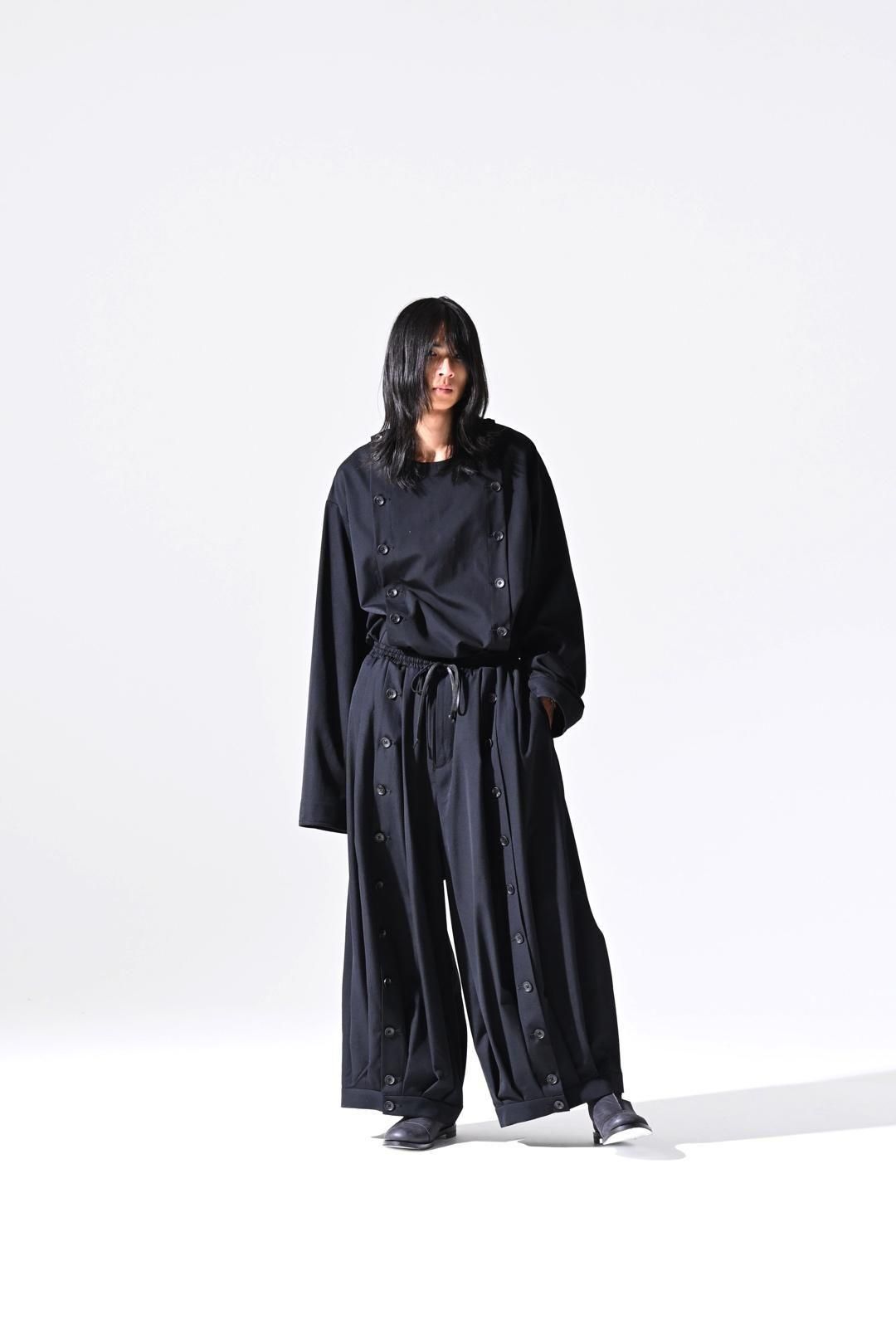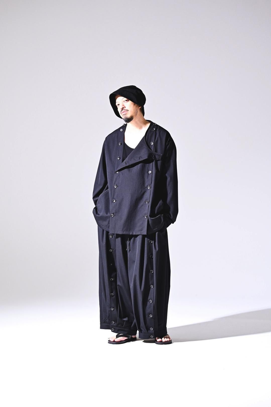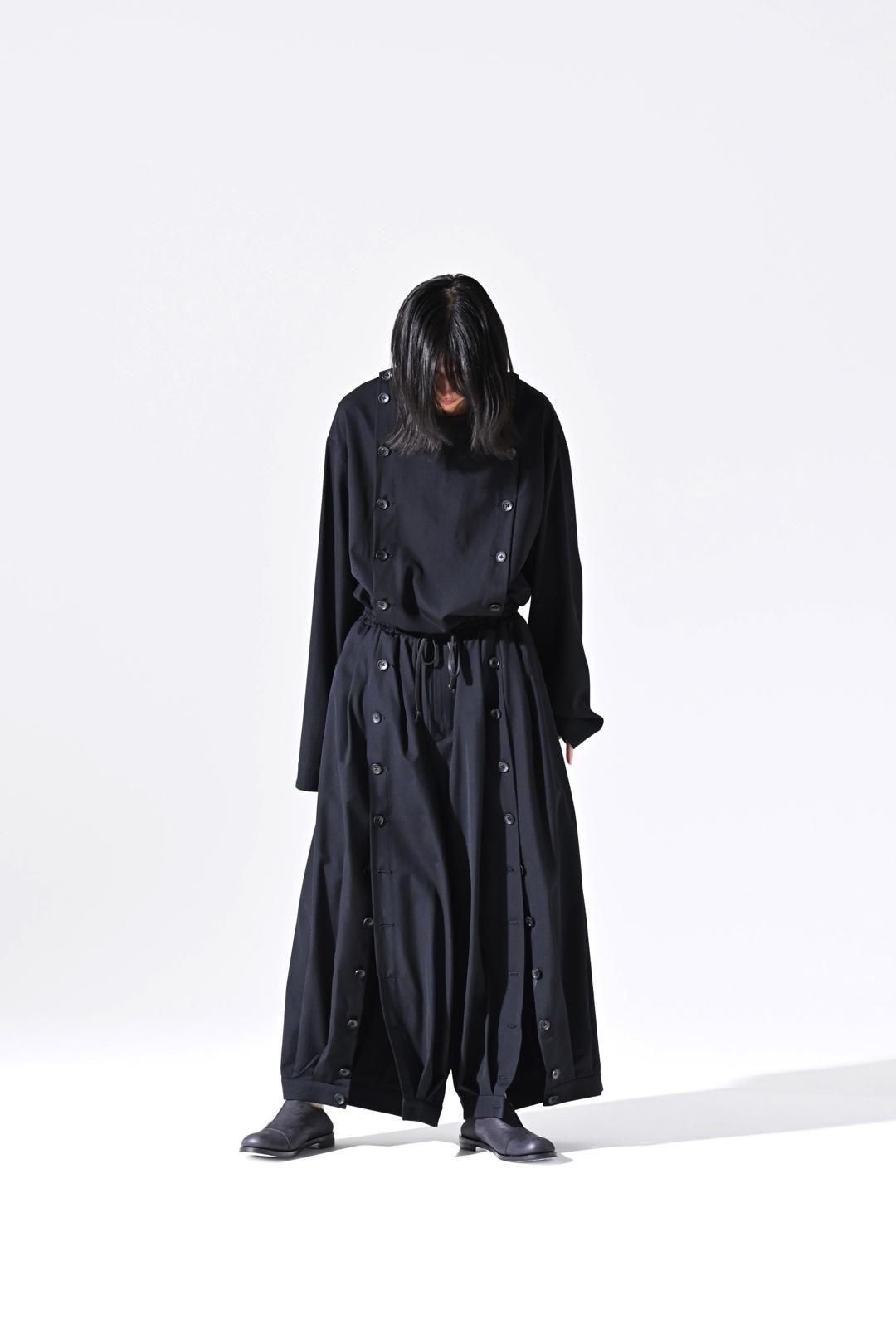 高級毛織物の産地"尾州"でBISHOOLオリジナルで生産したウールギャバジンを分量多く使用し、職人が手掛ける本水牛ボタンを贅沢に配したビッグパンツ。