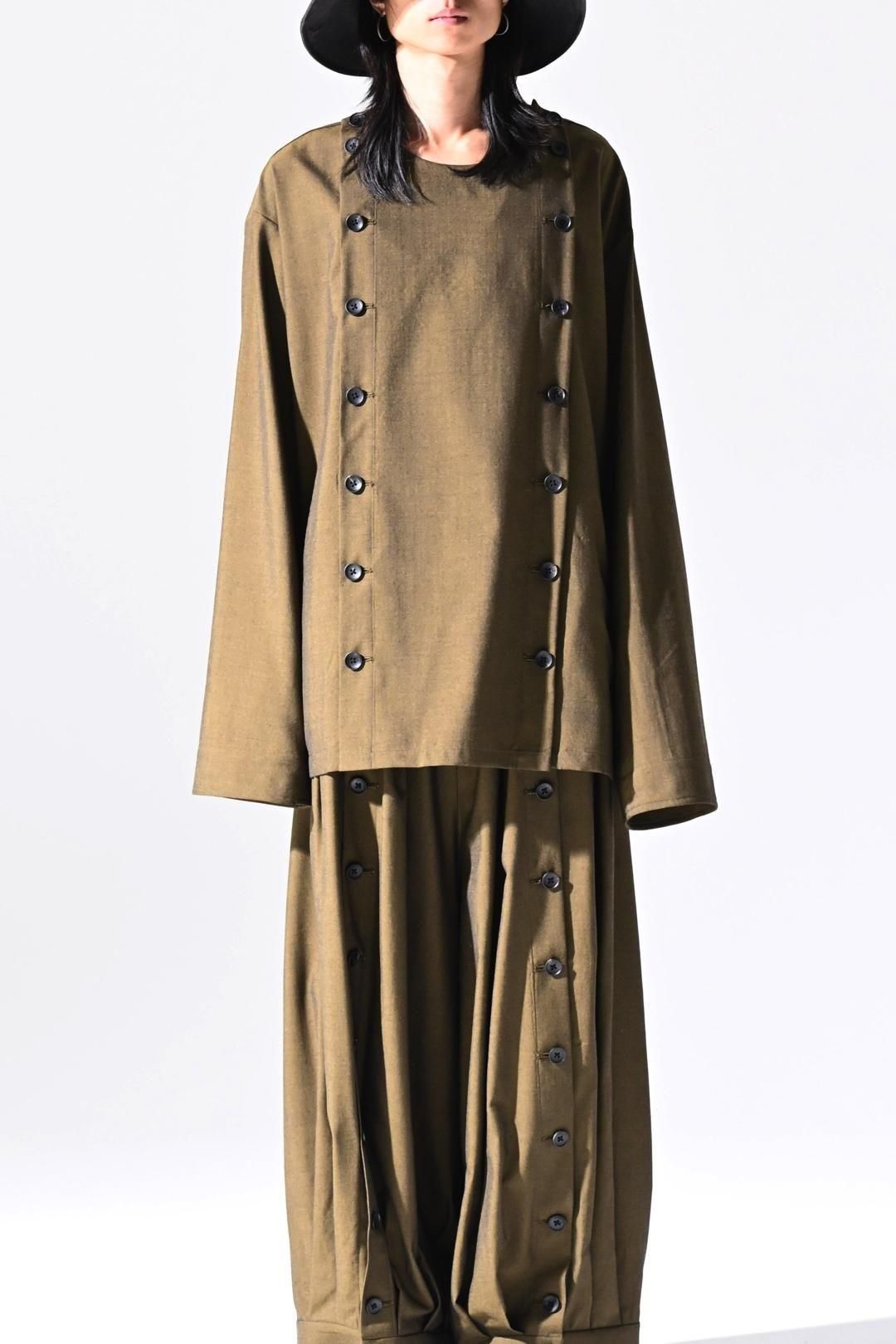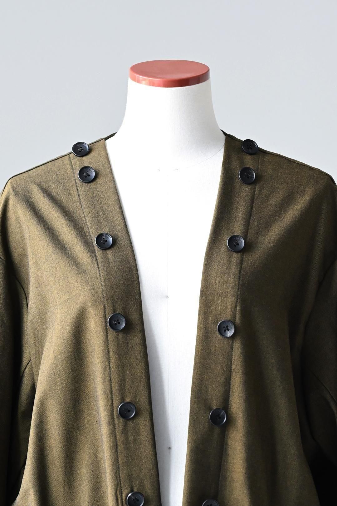 縦に10個配置した本水牛ボタンの重厚な雰囲気をお楽しみ頂くことが可能な1着。
